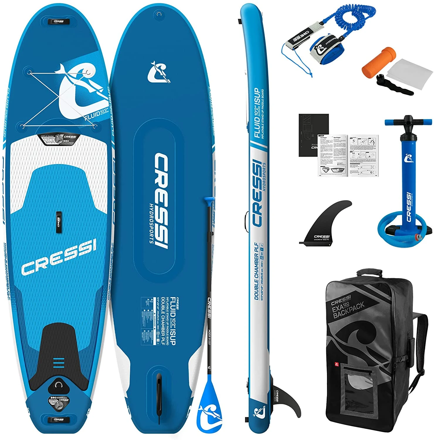 Eines für Alles. Alles in einem Unser vielseitigstes, sicherstes und leistungsfähigstes Board für alle aquatischen Bedingungen und Aktivitäten, sowohl für Lernende als auch für Fortgeschrittene geeignet, ideal für Seeausflüge in ruhigen oder unruhigen Gewässern bis hin zu Yoga und Fitness. Dank der Cressi Double Chamber PLF-Technologie kombiniert dieses aufblasbare Board auch außergewöhnliche strukturelle Steifigkeit mit der Sicherheit einer zweiten integrierten Luftkammer. Dank seiner großzügigen Dicke (15 cm) und großen Breite (81 cm) ist Fluid das ideale SUP, um jederzeit maximalen Spaß zu gewährleisten. Ausgestattet mit einer 8 Zoll-Finne Um die Manövrierfähigkeit zu erhöhen, vermittelt die klassische Allround-Form mit einem abgerundeten und gebogenen Bogen ein lineares und sanftes Paddelgefühl. Das rautenförmige Pad sorgt auch bei nassen, nackten Füßen für festen Halt. Fluid ist ein komplettes Set mit allem Zubehör, das Sie zum Üben benötigen. Dank der mitgelieferten Pumpe lässt es sich in weniger als 10 Minuten aufblasen. Technologie: Cressi Double Chamber PLF Doppelluftkammerkern aus vorlaminiertem Verbundwerkstoff ohne Verkleben für ein Board mit außergewöhnlicher Leistung in Bezug auf Steifigkeit/Gewichtsverhältnis und Stabilität. Die zentrale Kammer mit dediziertem Ventil gewährleistet eine verbesserte Leistung und größere Sicherheit bei der Verwendung im Falle von Luftlecks, die durch versehentliche Punktionen verursacht werden.
